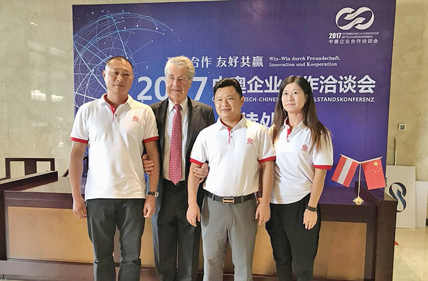 奥地利前总统海因茨·菲舍尔与jiuyou.com九游智能副总裁戴宝、揭阳分公司总经理林浩生、公司总裁助理郑庆丽合影