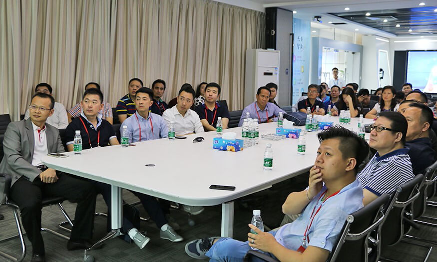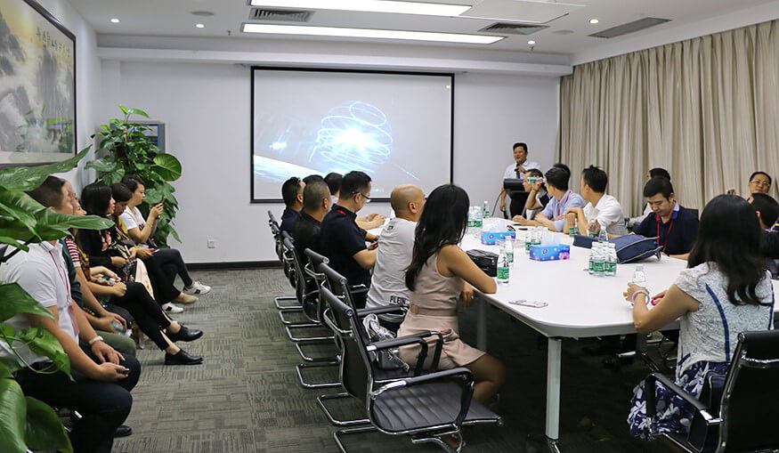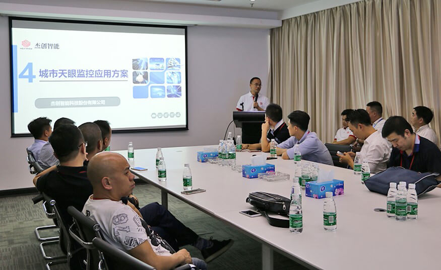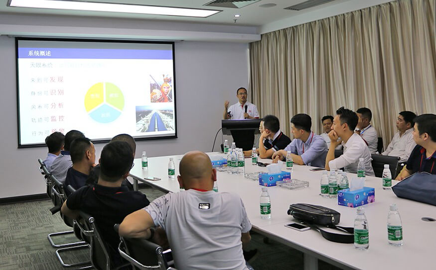 在公司展厅,董事长孙超及公司研发、技术等部门高管向各位学员介绍了公司的基本情况、发展历程、企业文化、研发团队、核心技术与产品、企业荣誉等方面的情况,以及公司自主研发的城市天眼监控应用方案、智慧城市解决方案、平安城市解决方案、智慧园区解决方案、智慧水务解决方案、数据中心综合管理系统、智能系统基础设施建设解决方案等智能化系统集成和解决方案,解说的同时还和大家分享了国内外相关成功案例,特别详细讲解了创建平安城市的利器——城市天眼监控应用方案,即天眼系统。